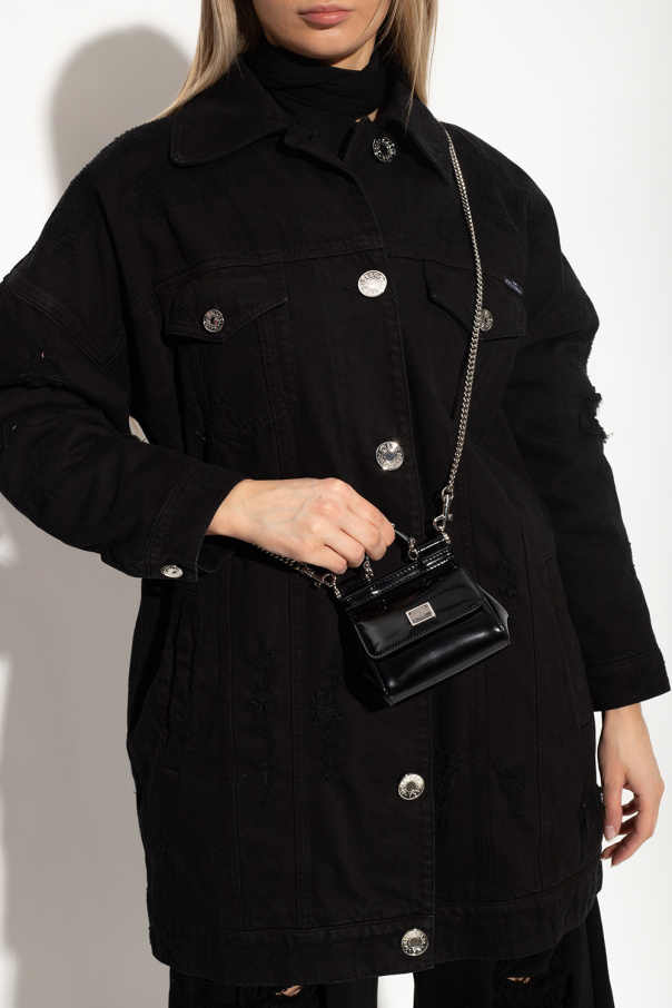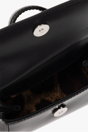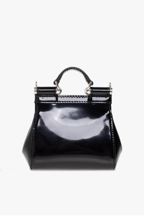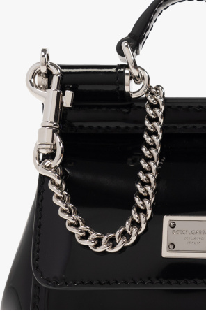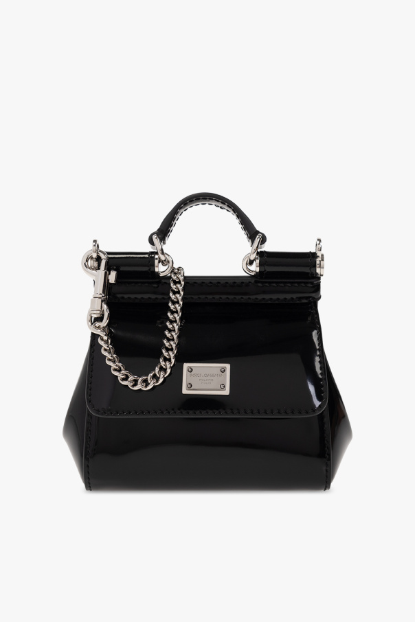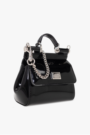 Black 'Sicily Mini' shoulder bag from Dolce & Gabbana x Kim. Crafted from patent leather, this design fastens with a snap and showcases a metal logo plaque on the flap, a half-round handle, a detachable chain strap, silver-tone metal hardware and one internal compartment.