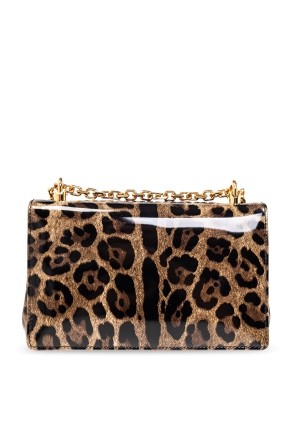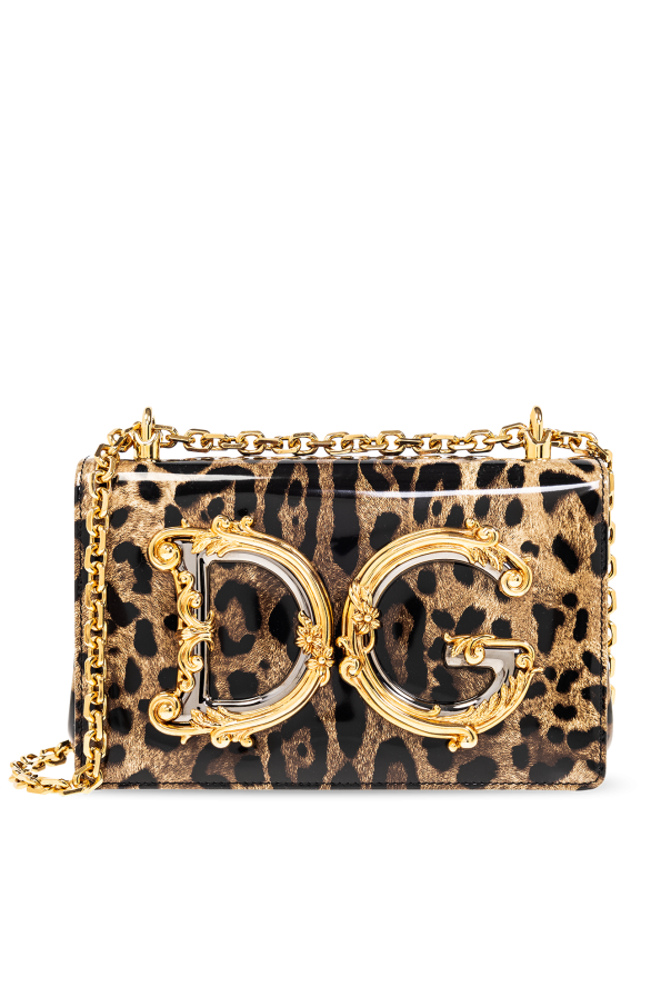 Brown and black 'DG Girls' shoulder bag from Dolce & Gabbana. Made from patent calf leather, this design secures with magnetic snaps and showcases a leopard print and logo plaque on the front. It is complete with a long chain strap, gold-tone metal hardware and one internal compartment with a slip pocket.