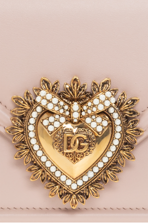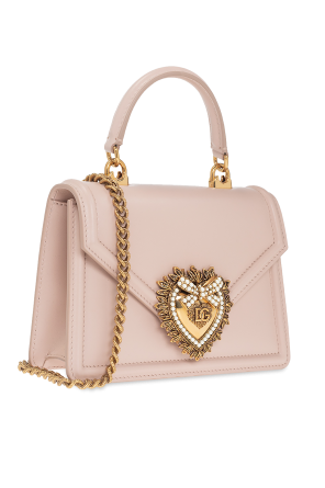Dolce & Gabbana 浅粉色“Devotion Small”单肩包。 这款款式采用小牛皮制成,采用磁性按扣固定,饰有金属心形贴花,饰有奶油色水晶徽标。 它还有一个半圆形手柄、可拆卸链条、金色金属硬件和一个带一个插袋的内部隔层。