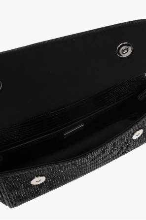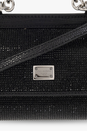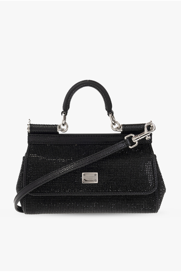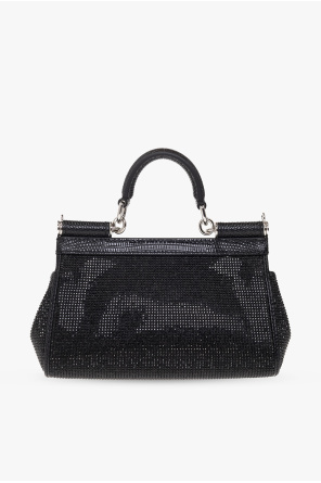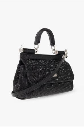 Black 'Sicily Small' shoulder bag from Dolce & Gabbana x Kim. Crafted in crystal-embellished material, this design fastens with snaps and features a lizard skin effect leather trim, a half-round handle, a detachable and adjustable shoulder strap, silver-tone metal hardware and one internal compartment with a slip pocket.