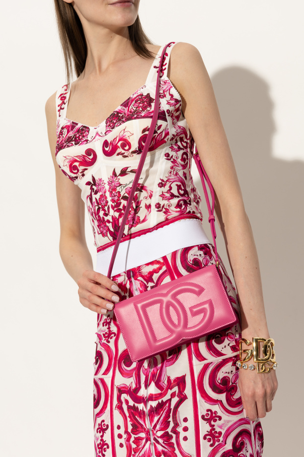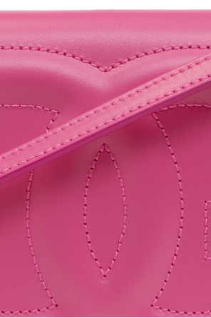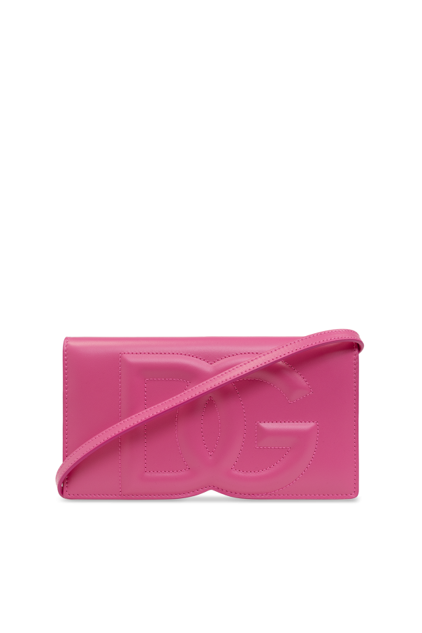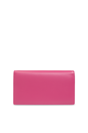 Pink wallet from Dolce & Gabbana. Made of leather, this design secures with magnetic snaps and showcases the brand's logo on the front. It is complete with a detachable and adjustable shoulder strap, gold-tone metal hardware and one internal compartment with one zip coin pocket and six card slots.
