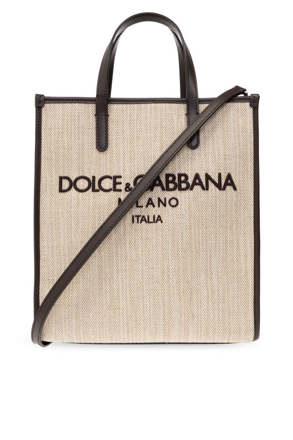 Beige shopper bag from Dolce & Gabbana. Crafted from linen and cotton canvas with brown leather trims, this model fastens with a snap closure and is decorated with a logo embroidery. It is complete with two half-round handles, a detachable and adjustable shoulder strap, silver-tone metal hardware and one internal compartment with one zip pocket.