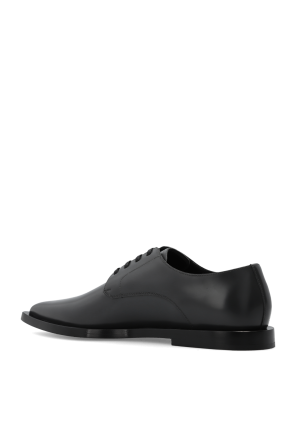 Grey derby shoes from Dolce & Gabbana. Made of patent leather, this lace-up pair features a pointed toe and black rubber-trimmed leather sole.