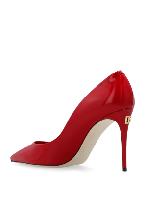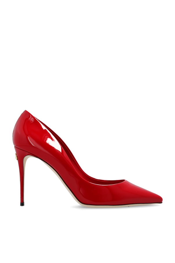 Red ‘Cardinale’ pumps from Dolce & Gabbana. Crafted from patent leather, this pair features a pointed toe, heel with a logo detail in gold-tone and a black leather sole.
