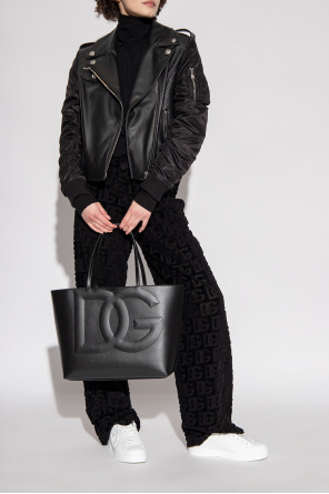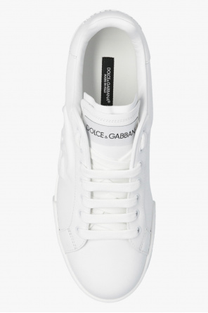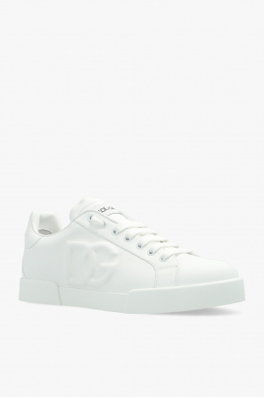 White ‘Portofino’ sneakers from Dolce & Gabbana. Crafted from calf leather, this lace-up model sits on a white rubber sole and showcases a logo patch and tactile branding.