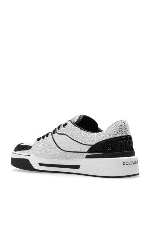White and black ‘New Roma’ sneakers from Dolce & Gabbana. Crafted from smooth leather, this lace-up pair sits on a black and white rubber sole and is embellished with crystals, a logo patch on the tongue and perforations.