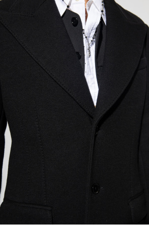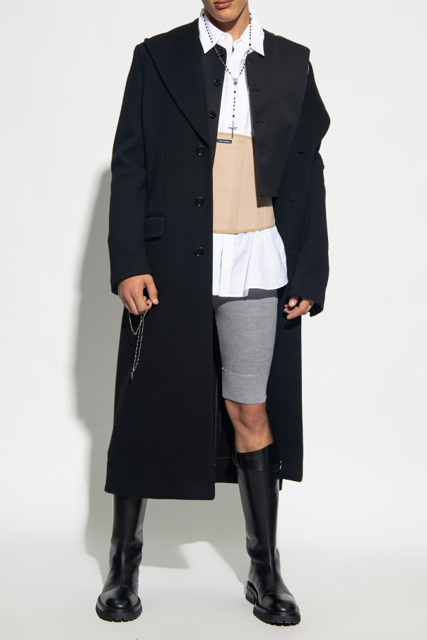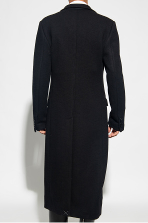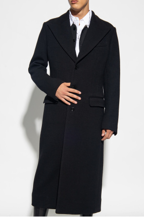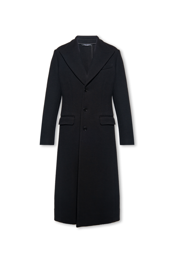 Black coat from Dolce & Gabbana. Made from a wool blend, this style is cinched with a tie belt at the waist and features a single back vent, button fastenings, peak lapels, two flapped pockets, one welt pocket and long sleeves.