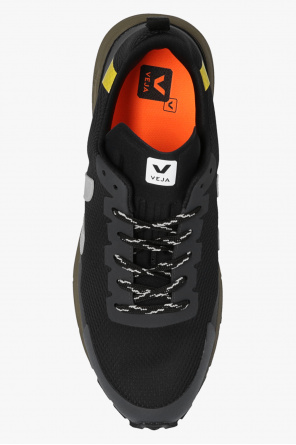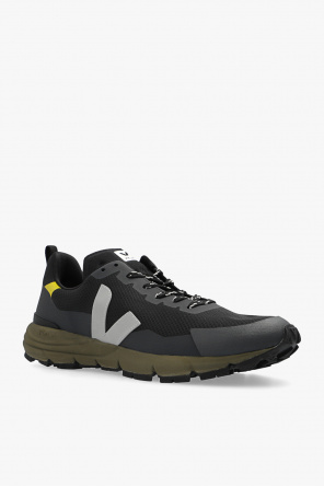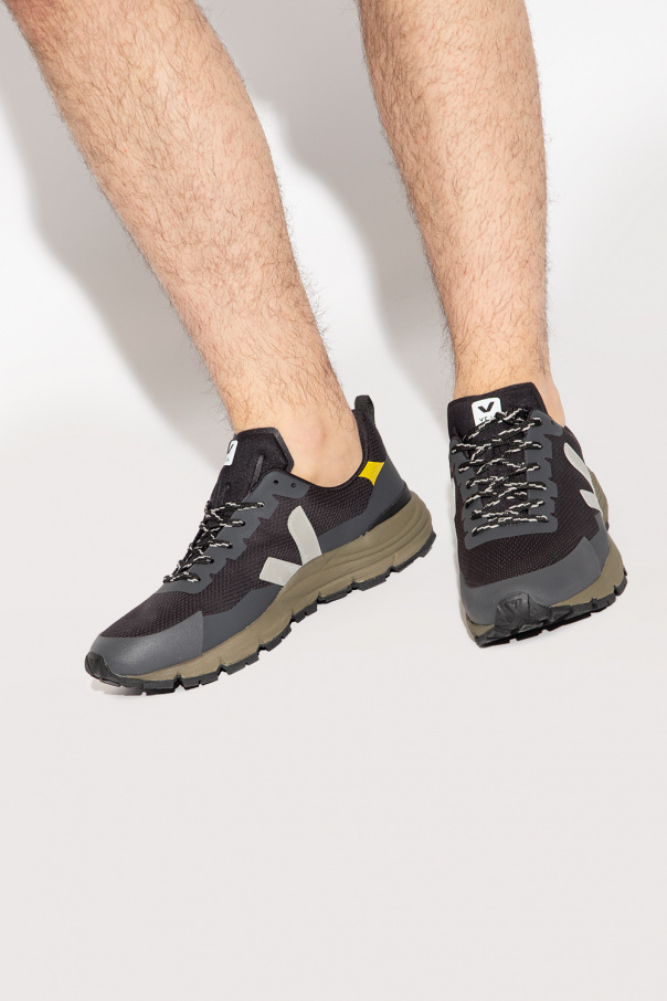 Black 'Dekkan' sneakers from Veja. Crafted with Alveomesh (100% recycled polyester), this lace-up model showcases the brand's signature grey V logo patch in rubber and rice waste. The sole blends ecological materials and Vibram’s technology. Vibram is the world leader in technical soles made for hiking and trekking. The organic-sourced and recycled insole consists of sugar cane, Amazon rubber, organic cotton and recycled EVA. It is set on a green rubber sole made from organic and recycled materials.