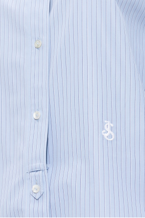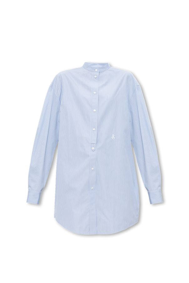 JIL SANDER 蓝色棉质小高领衬衫。宽松店,纽扣开合,细条纹图案,正面饰有白色徽标刺绣,长袖配有纽扣袖口。