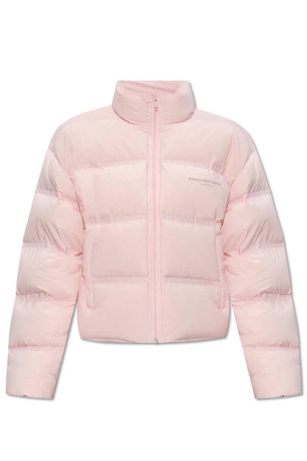 Light pink, quilted down jacket from Alexander Wang. Cut with a cropped fit, this style fastens with a zip and showcases a grey logo application, a standing collar, two zip pockets, long sleeves with elasticated cuffs, and a drawcord-adjustable hem.