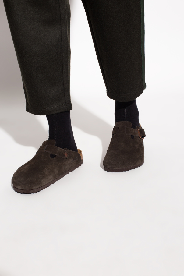 Birkenstock的深棕色Boston BS麂皮穆勒鞋,配有带logo压花铜色搭扣的带子。深棕色鞋底利用天然栓皮和EVA泡棉制成。