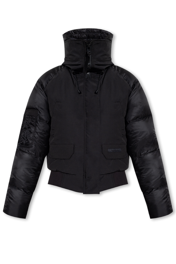 Black ‘Paradigm Chilliwack’ down bomber jacket from Canada Goose. Crafted from waterproof fabric with a matte finish, this design features a two-way zip and snaps, logo patch on the shoulder, drawstring hood, two slip pockets, two snap-fastened flap pockets and ribbed trims at the hem and cuffs.