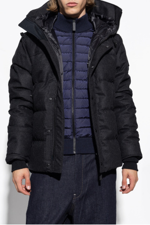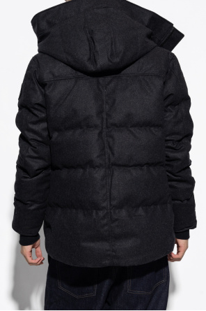 Black ‘McMillan’ down jacket from Canada Goose. Crafted in DynaLuxe Wool, a two-layer, windproof Italian wool natural feather padded with down and feathers with 625 fill power. Fastened with a two-way zip and snaps, this design features a logo patch on the shoulder, two zip pockets, drawstring hood, long sleeves with ribbed cuffs and elastic internal shoulder straps with a logo. Temperature range: -10°C to -20°C.
