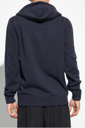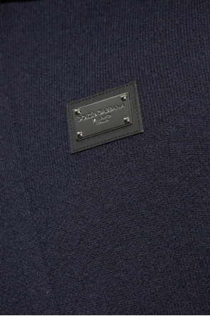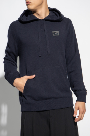 Dolce & Gabbana 的海军蓝毛衣,采用羊毛和羊绒混纺面料制成,配有抽绳兜帽、两个前袋、银色金属徽标压花饰牌贴片以及罗纹边。