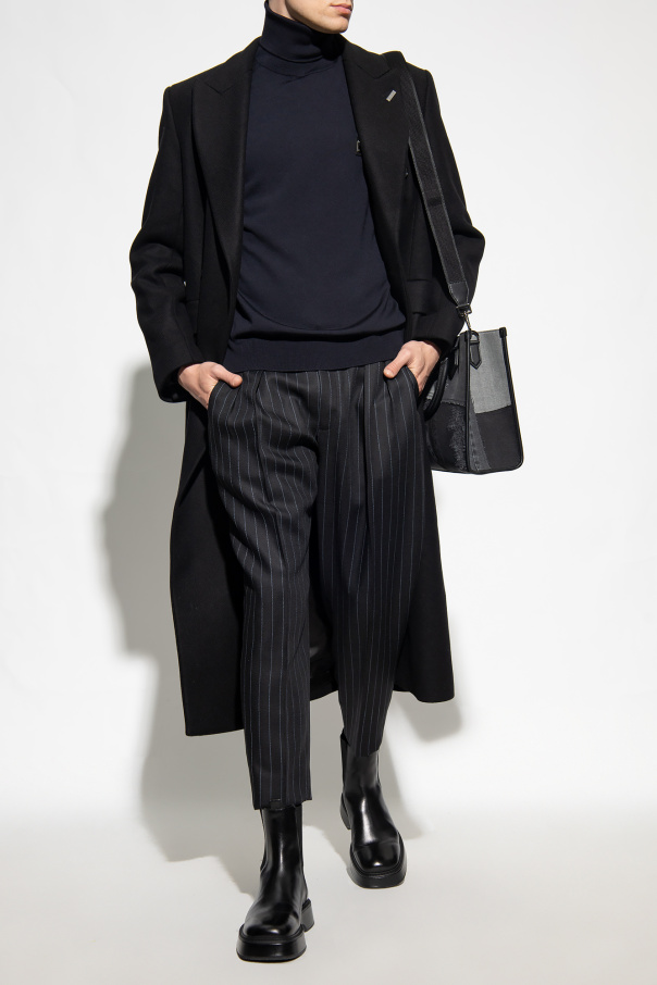 Navy blue turtleneck sweater from Dolce & Gabbana. Made of virgin wool, this style features a snug collar, long sleeves, ribbed trims on the bottom hem and cuffs and a silver-tone metal logo plaque on the front.
