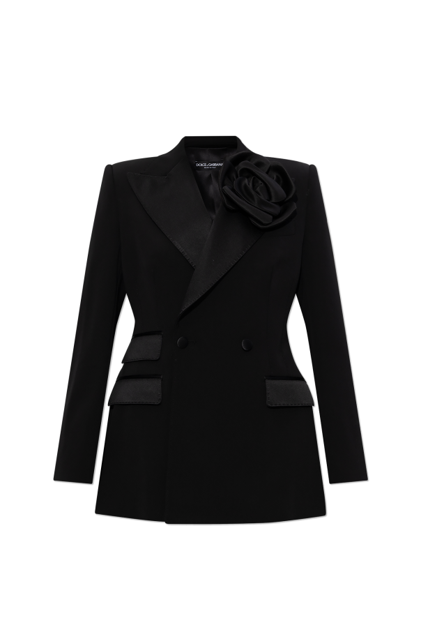 Black blazer from Dolce & Gabbana. Crafted from a wool and silk blend, this design features buttons, a floral patch, three flap pockets, one slip pocket, padded shoulders, double rear vent and long sleeves.