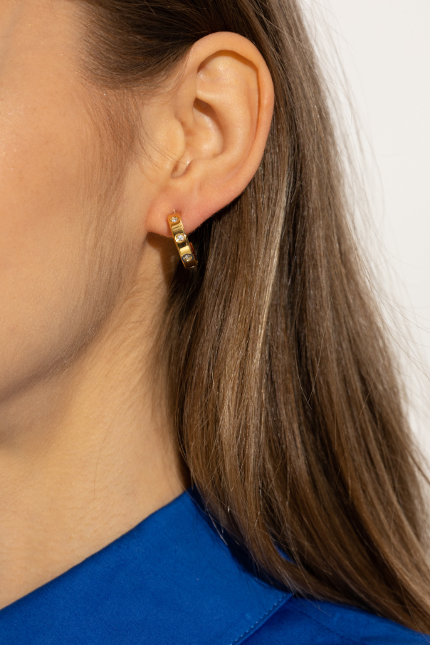 Gold-tone earrings from Kate Spade. This push-back pair is encrusted with cubic zirconia and engraved with a logo.