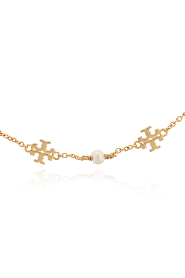 Gold-tone ‘Kira’ bracelet from Tory Burch. Made of brass, this item features logo applications, pearl embellishments and a lobster clasp fastening.