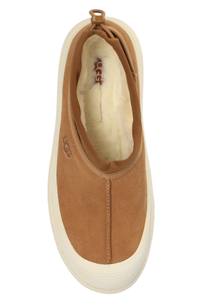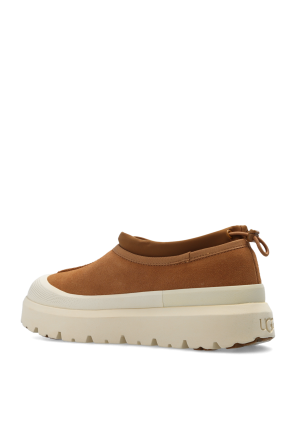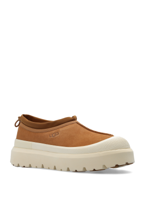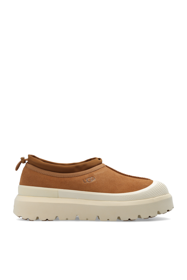 Light brown ‘Tasman Weather Hybrid’ shoes from UGG. Made of waterproof suede with a slip-on silhouette, this model sits on a cream Spider Rubber® sole with pods for traction and features an embossed logo, a drawstring back and UGGplush ™ lining – a blend of wool and recycled material.