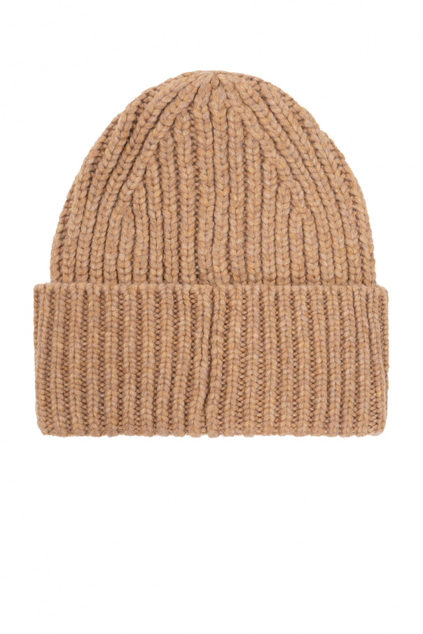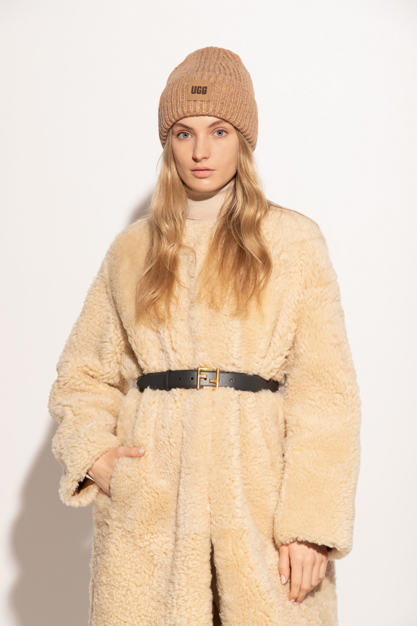 UGG的米色针织套头帽,饰以米棕色logo贴花。
