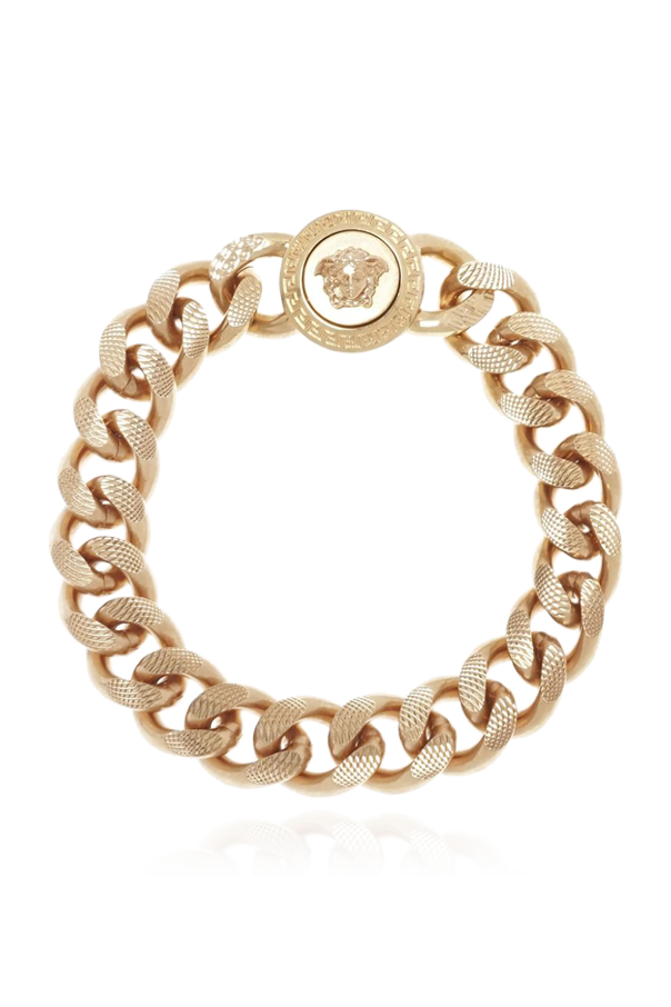 Versace的金色金属手镯。附按扣。附含希腊风格图案的Medusa头饰。
