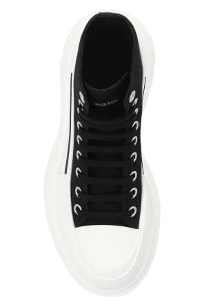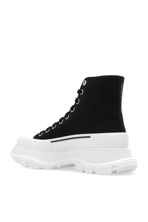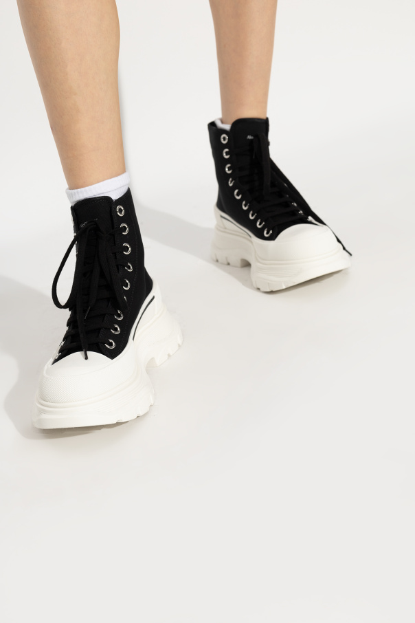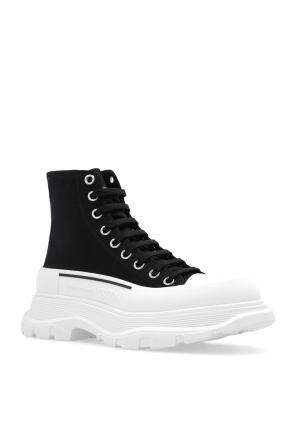 Alexander McQueen的黑白色高帮运动鞋,系带设计。采用材质制成。橡胶饰边。饰有标志。白色橡胶外底。附带可更换的鞋带。