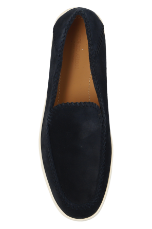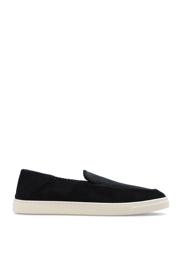 Giorgio Armani的深蓝穿套式鞋,采用绒面皮制成,饰以缝线。奶油色橡胶鞋底搭配凸起标志。