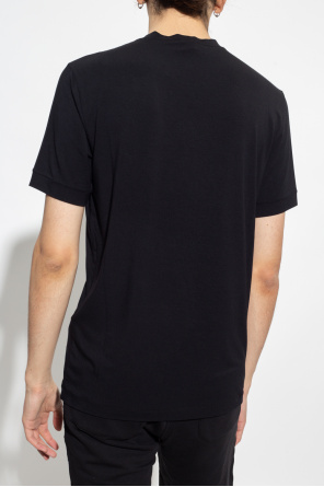 Giorgio Armani的黑色棉质圆领T恤。 短袖,松紧衣领,灰色的品牌标志图案。