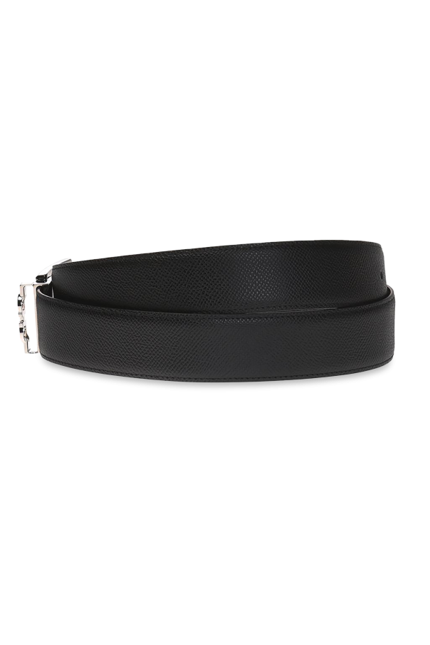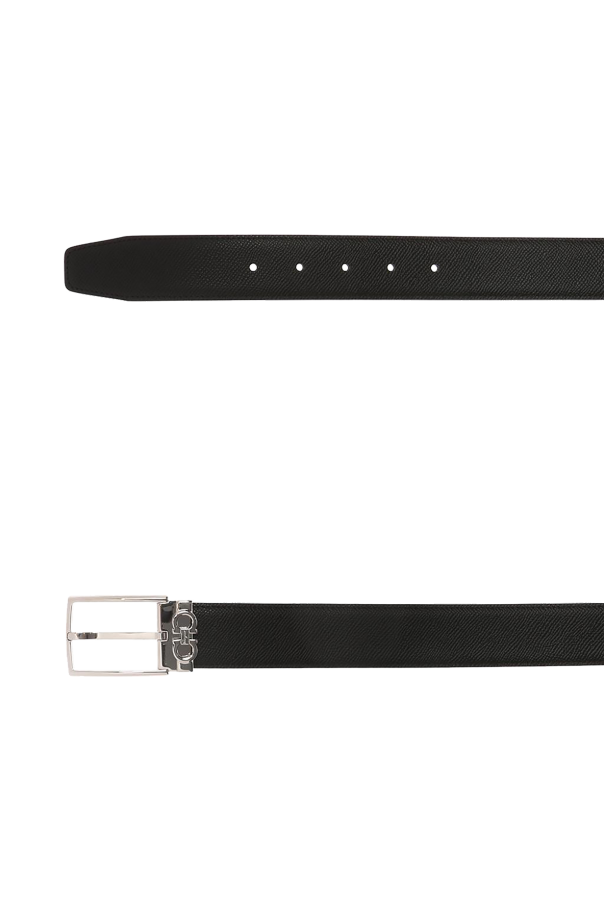 这款黑色双面可调皮带来自Salvatore Ferragamo,以粒面小牛皮制成,配有可拆卸标识形搭扣。银色五金配件。