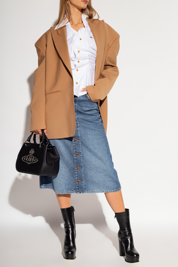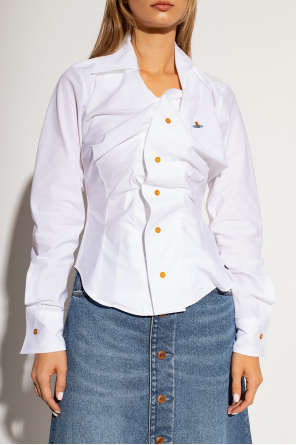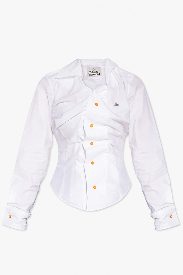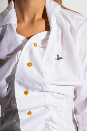 Vivienne Westwood 白色合身衬衫,配有领带,采用来自可持续生态农场的有机棉制成,配有棕色纽扣、彩色徽标刺绣和翻边长袖。
