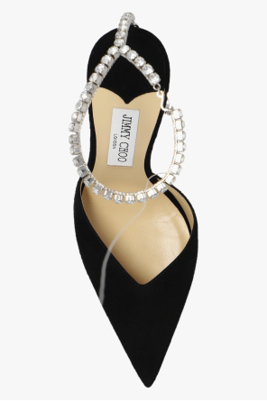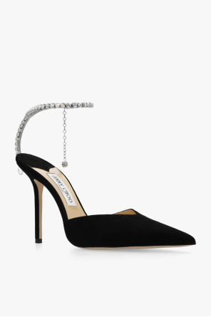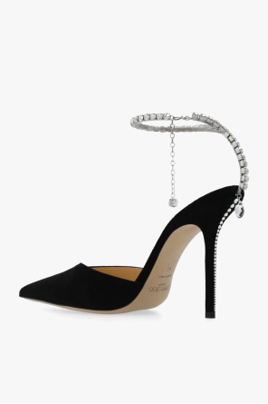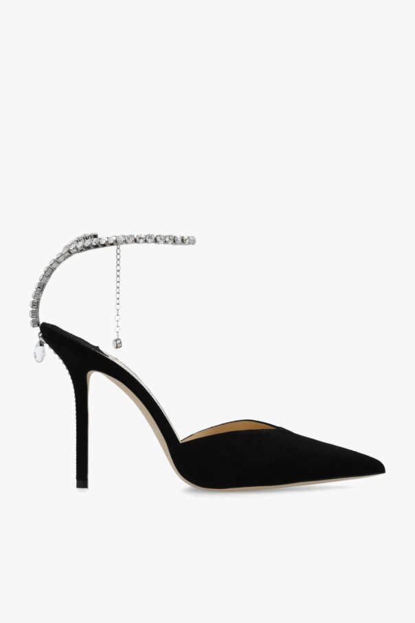 Black ‘Saeda’ pumps from Jimmy Choo. Made of suede, this model features a pointed toe, a crystal-bejewelled chain strap, glossy appliqués and a cream leather sole.