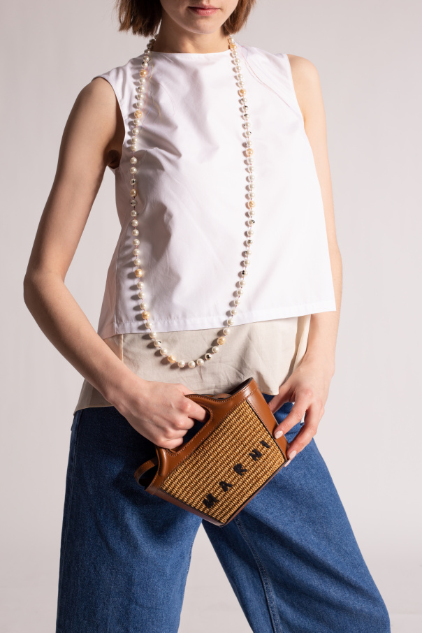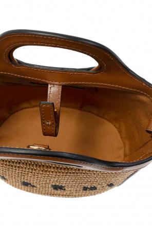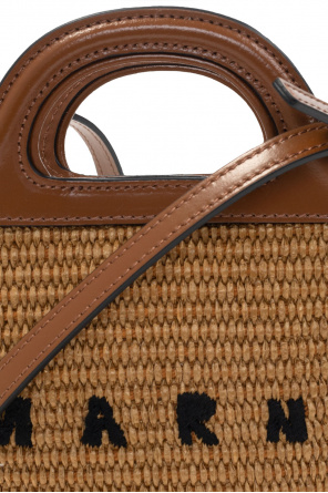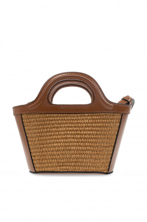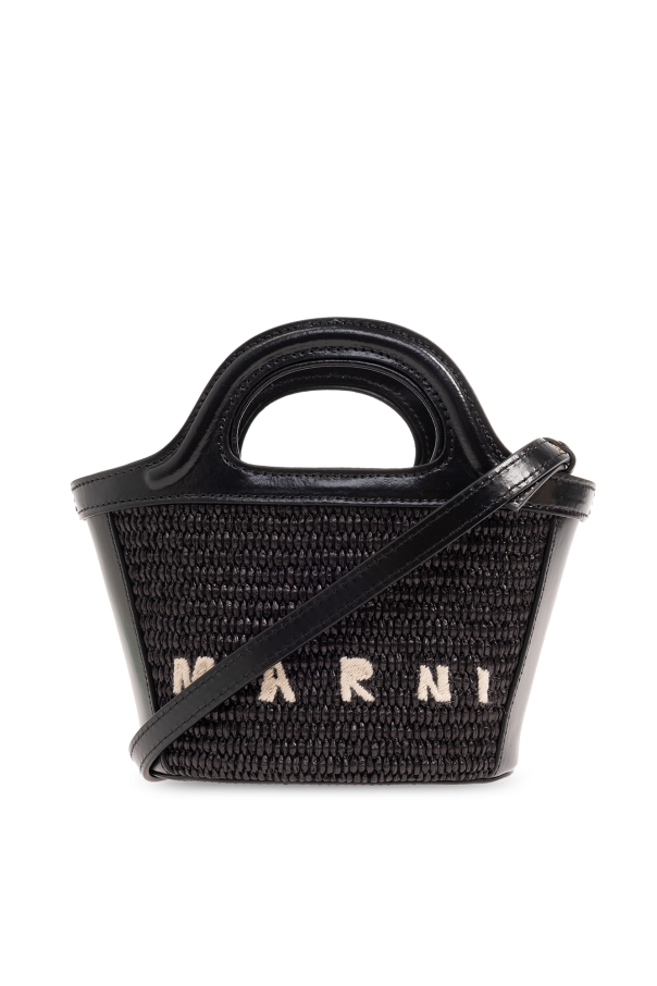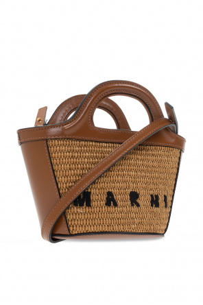 Brown ‘Tropicalia’ shopper bag from Marni. Size micro. Embellished with an embroidered black logo on the front, this design fastens via a hook and features two half-round handles, a detachable and adjustable shoulder strap, gold-tone metal hardware and one internal compartment with a card slot.