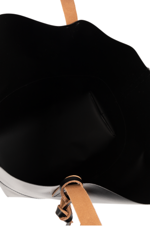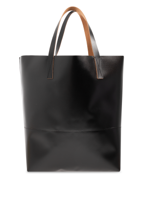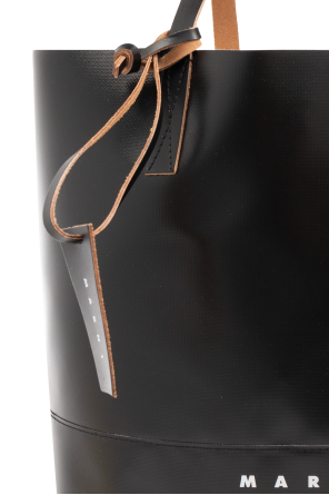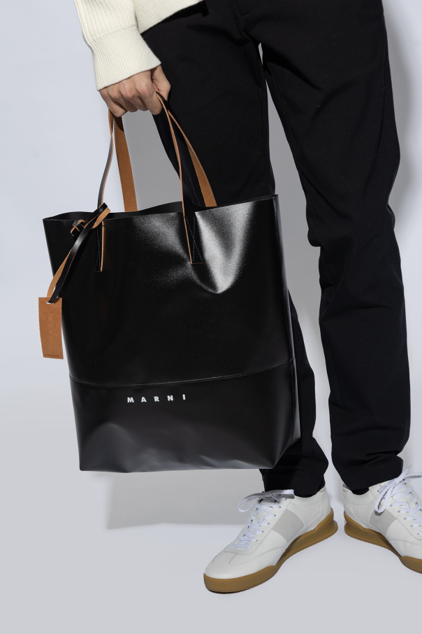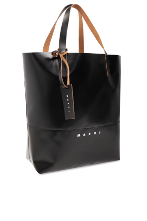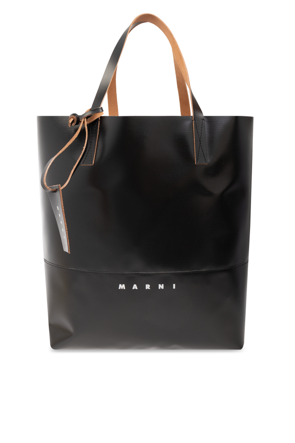 Marni的黑色Tribeca托特包,采用人造材料制成,配皮革饰边。正面印有白色标志。两个半圆形手柄,带有烫印标志的吊饰。内部设有一个主隔层。