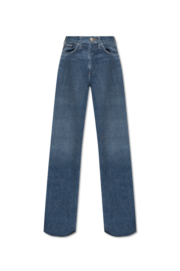 Rag & Bone的高腰Miramar Sofie棉质裤子,蓝色,纽扣和拉链开合。饰有仿牛仔印花的‘Trompe l’ Oeil’效果图案。两个插袋。长而宽松的裤腿。