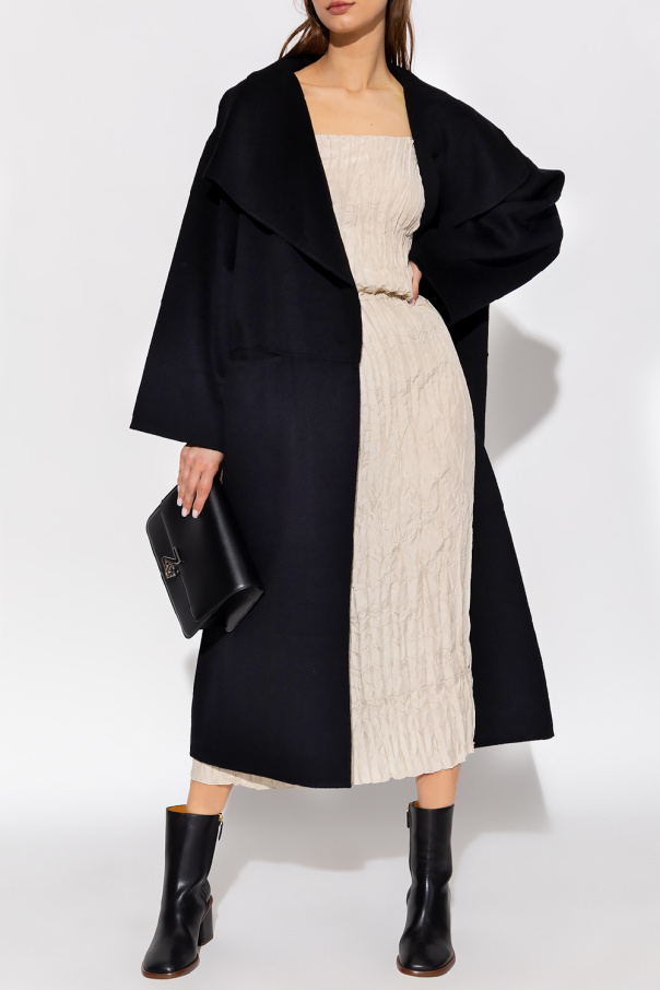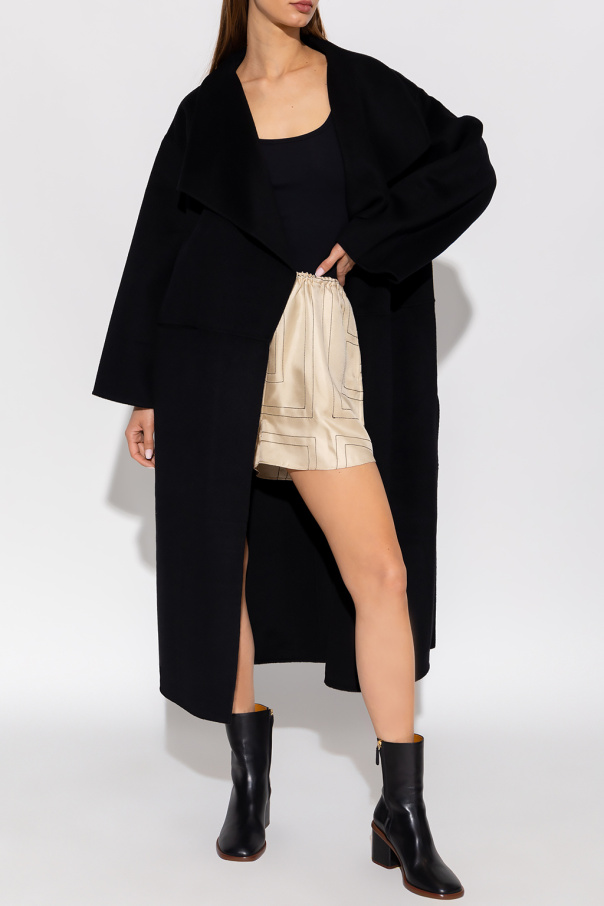 Beige pyjama shorts from Toteme. Made of silk, this short leg design features an elastic waistband and embroidered monogram pattern in black.