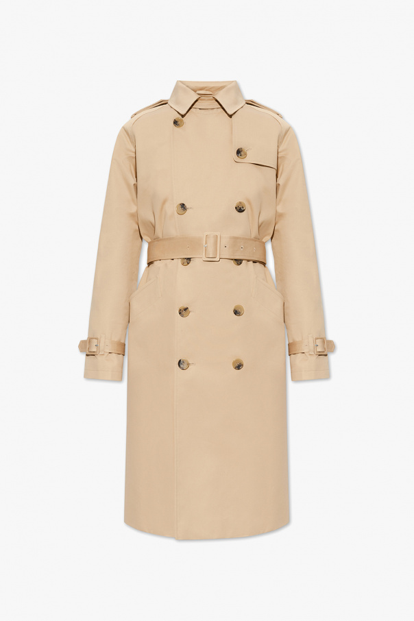 Beige trench coat from A.P.C. Crafted from cotton, this style features a double-breasted silhouette with buttons, a waist-cinching buckle belt, two slip pockets, a single back vent and long sleeves with buckle adjusters.