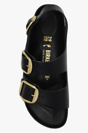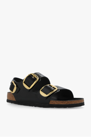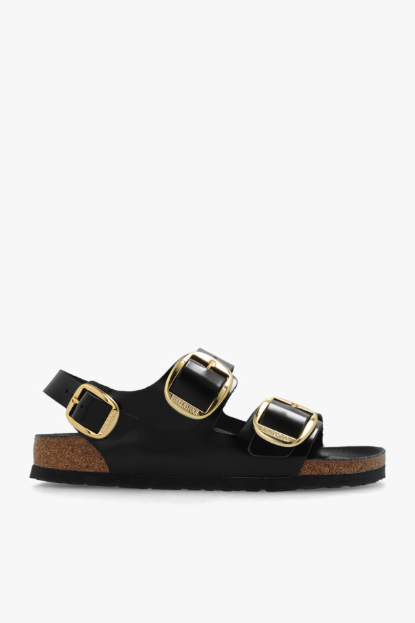 Black ‘Milano Big Buckle’ sandals from Birkenstock. Made of leather, this model sits on a black EVA foam sole and features adjustable straps with gold-tone buckles, an embossed logo on the side and an anatomically shaped cork-latex footbed. Narrow width.