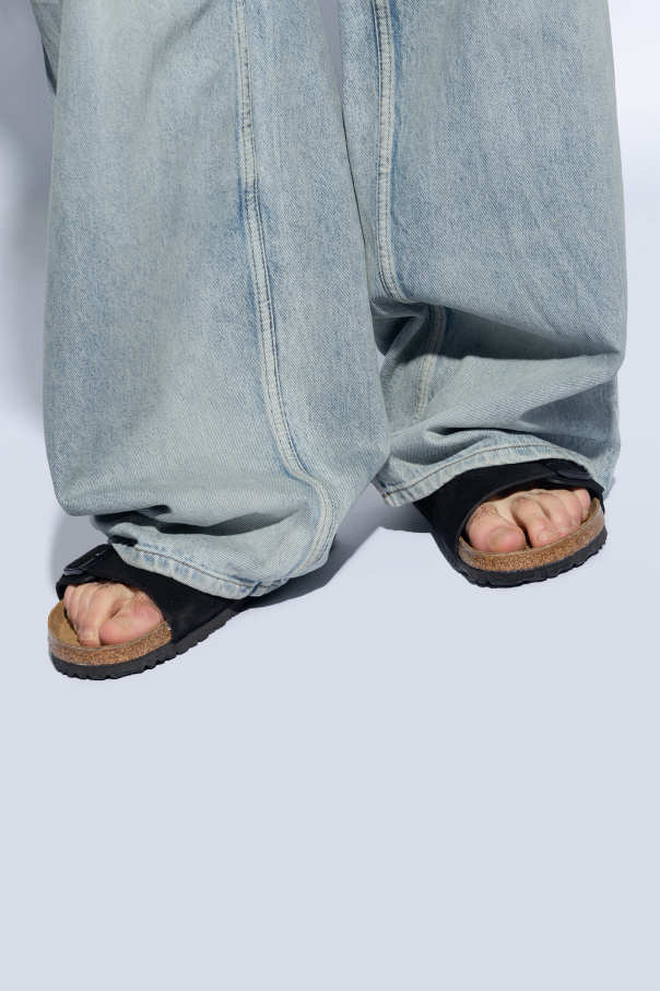Black ‘Arizona BS’ slides from Birkenstock. Made of suede, this model sits on a black EVA foam sole and features a standard-width, anatomically-shaped cork-latex footbed, adjustable buckle straps and an embossed logo on the side.