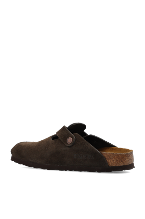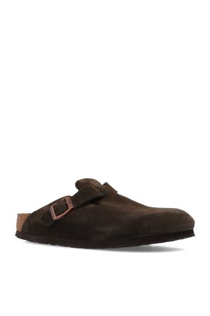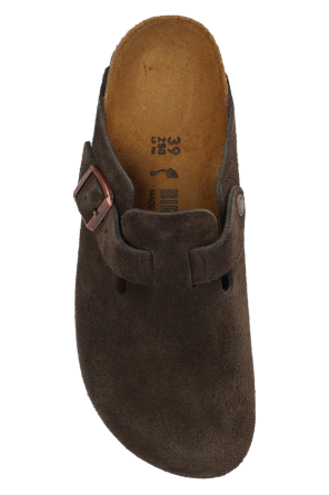 Birkenstock的深棕色Boston BS拖鞋。采用绒面皮制成。正面配有可调节的带扣带。侧面有压花标志。带有锥形状的解剖学设计的软木乳胶鞋垫。深棕色EVA泡沫外底。