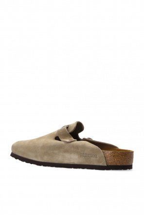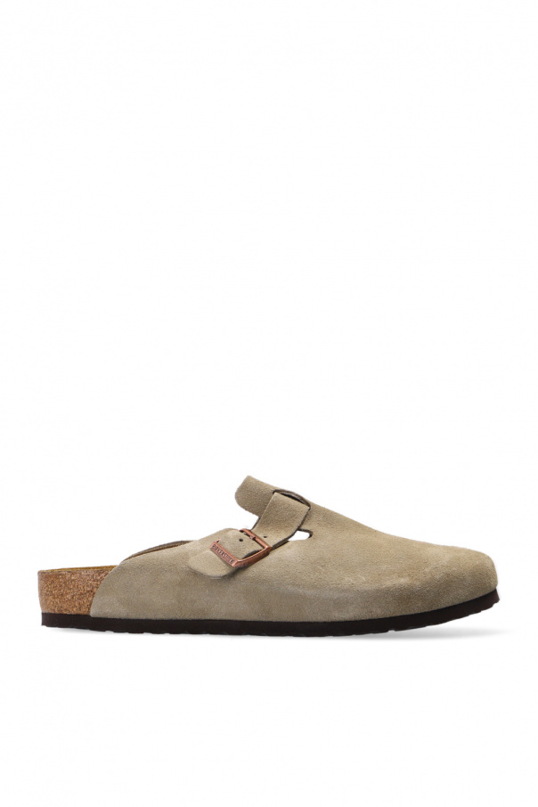 Birkenstock的米色'Boston BS'拖鞋。由绒面革质制成。附饰带,饰有黄铜色logo压花搭扣。EVA中底。深棕色软木鞋底。