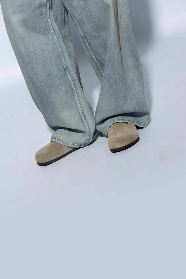 Birkenstock的米灰色Boston BS拖鞋。采用绒面皮制成。正面配有带扣调节带。侧面有压花标志。标准宽度的经过解剖学设计的软木乳胶鞋垫。棕色EVA泡沫外底。