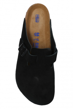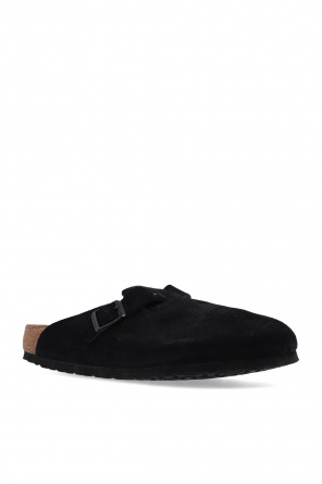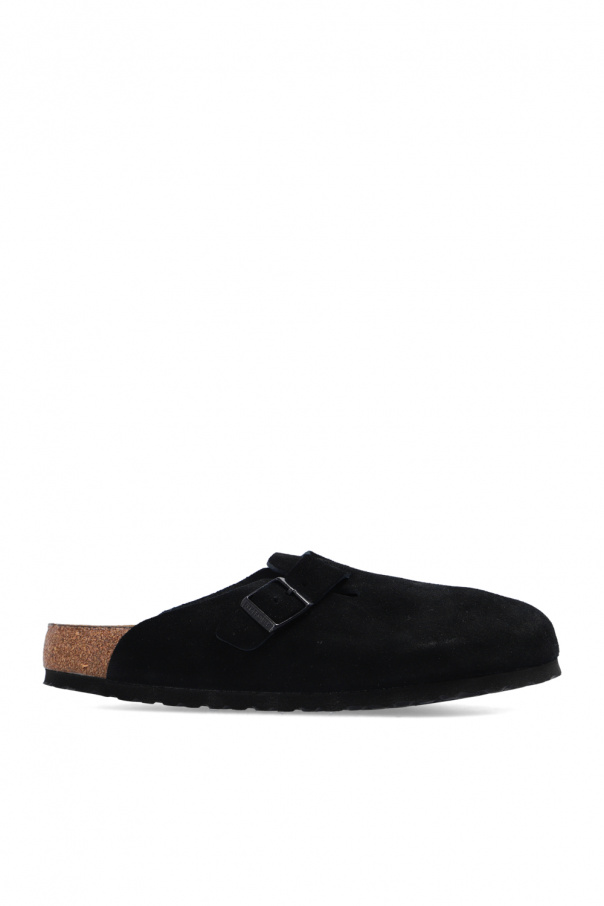 Birkenstock的黑色'Boston BS'拖鞋。由绒面革材质制成,配有带徽标压花搭扣的肩带,天然软木和 EVA 鞋底。