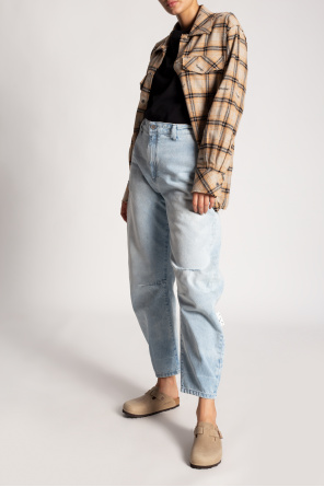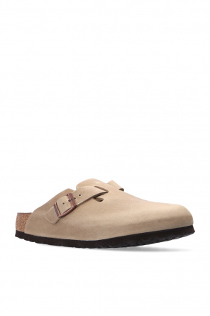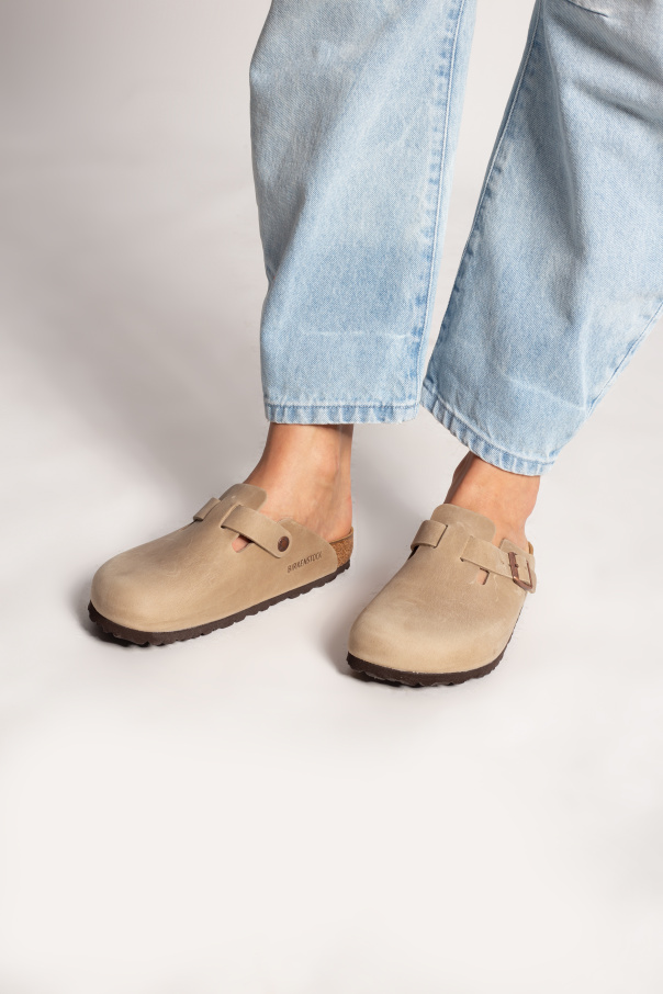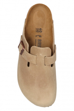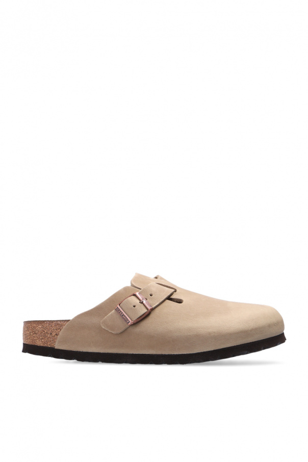 Birkenstock的米色调Boston BS拖鞋。皮革质。铜色调搭扣带含logo。软木及EVA泡沫质棕色鞋底。