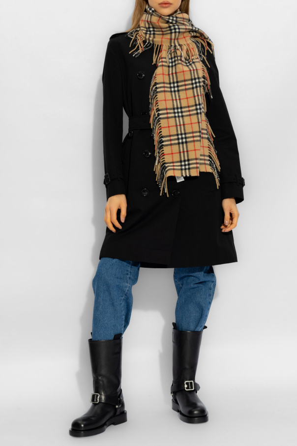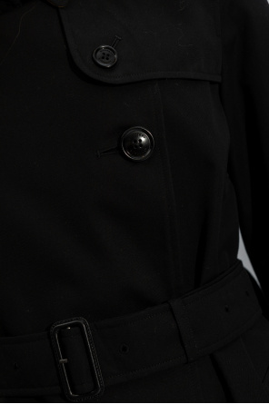 Black trench coat from Burberry. Made of cotton with a double-breasted silhouette, this style features a waist-cinching tie belt, button fastenings, two slip pockets, shoulder epaulettes and long sleeves.