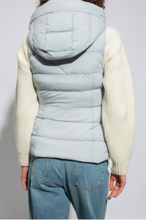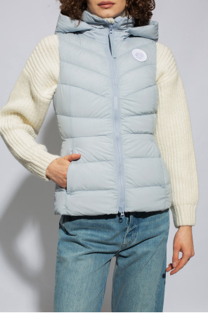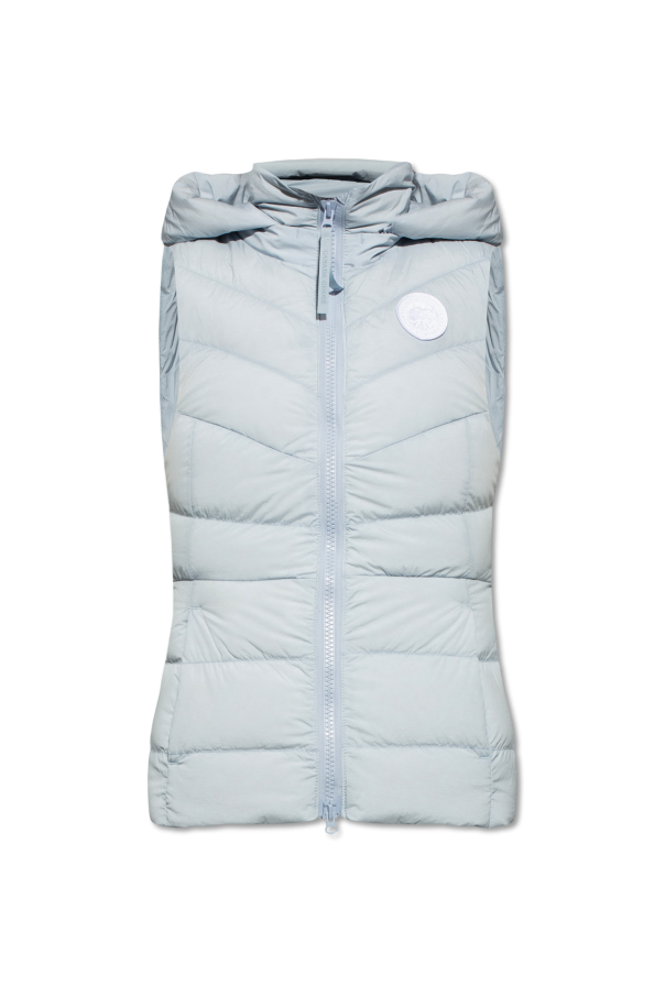 Light blue ‘Clair’ down vest from Canada Goose. Emblazoned with a logo patch, this style fastens with a zip and features a detachable drawstring hood, quilted detailing and two zip pockets. Temperature range: 5°C/-5°C.