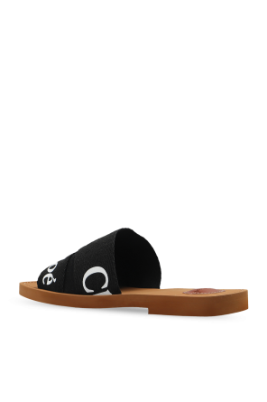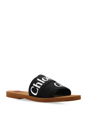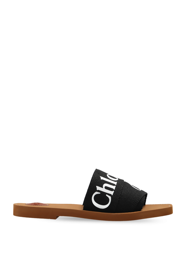 Chloé的黑色'Woody'拖鞋。棕色橡胶鞋底。饰有白色徽标印花。