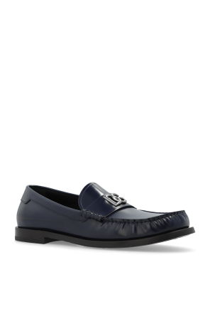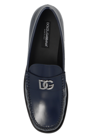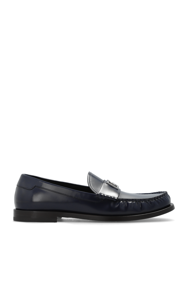 Dolce & Gabbana的深蓝色乐福鞋。采用皮革制作。前部饰有银色标志贴饰。黑色皮革鞋底。