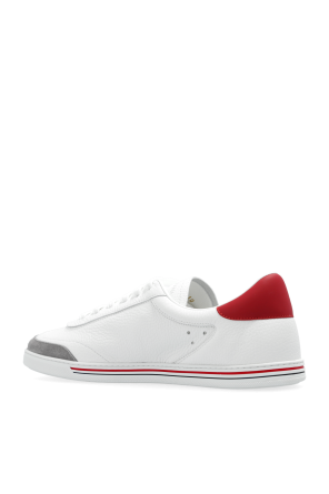 White ‘Saint Tropez’ sneakers from Dolce & Gabbana. Made of leather, this lace-up pair features grey suede on the toe, an embossed logo on the tongue, a dark red heel counter and a white rubber sole.