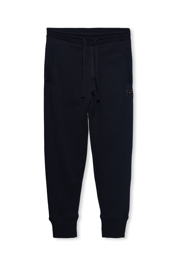 Dolce & Gabbana的酒红色裤子。采用羊毛和喀什米尔混纺面料制成。腰部设有松紧抽绳设计。饰有标志贴花。三个拉链口袋。锥形长裤腿,松紧裤口。