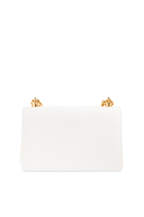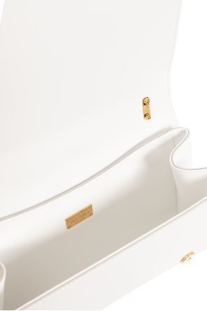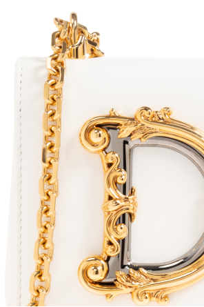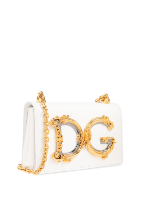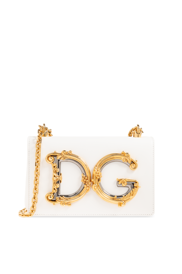 Dolce & Gabbana的白色DG Girls单肩包,采用光滑皮革制成。磁扣开合。正面饰有金色和银色标志贴饰。配短链条。内部设有一个主隔层。金色金属配件。